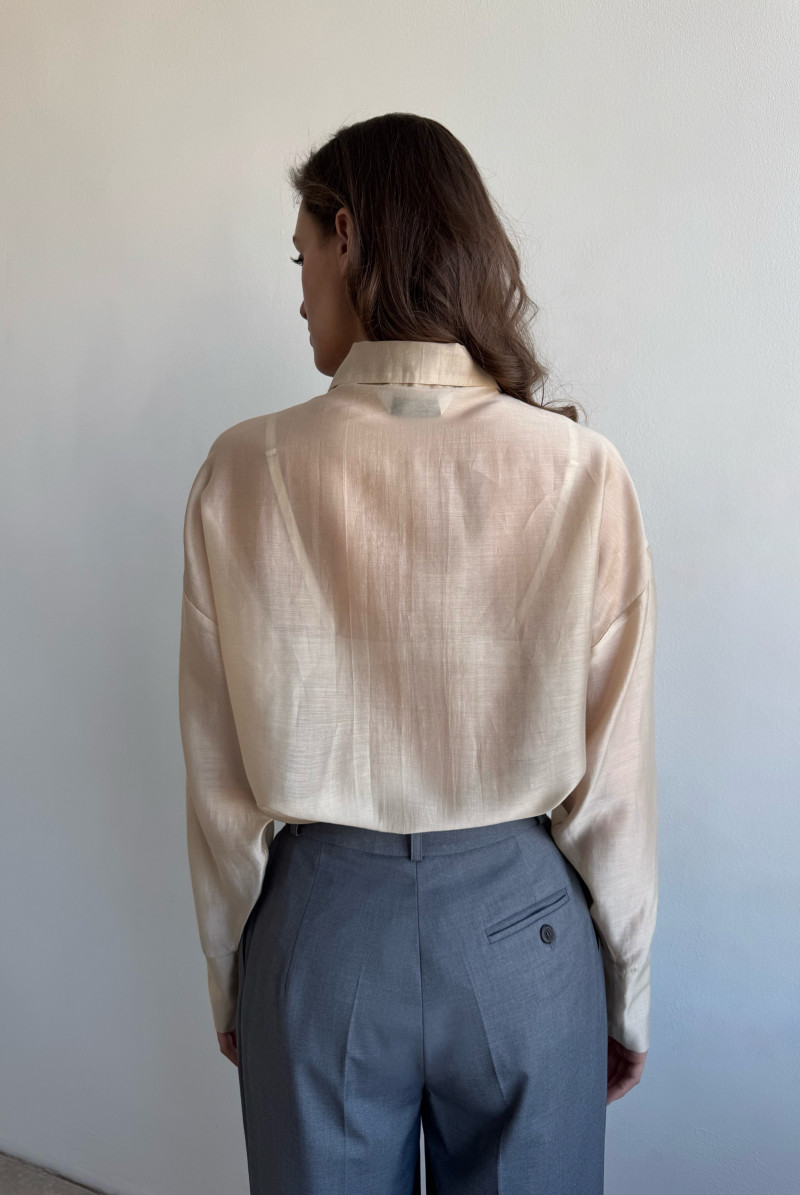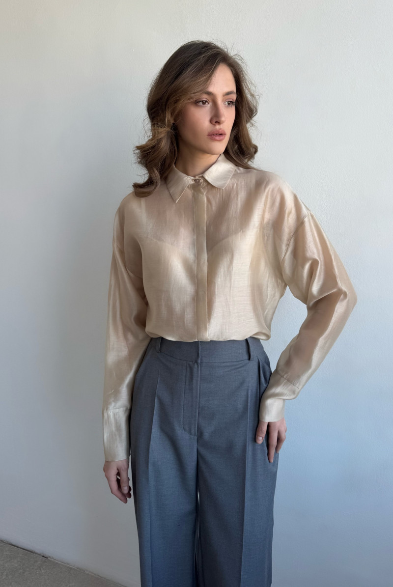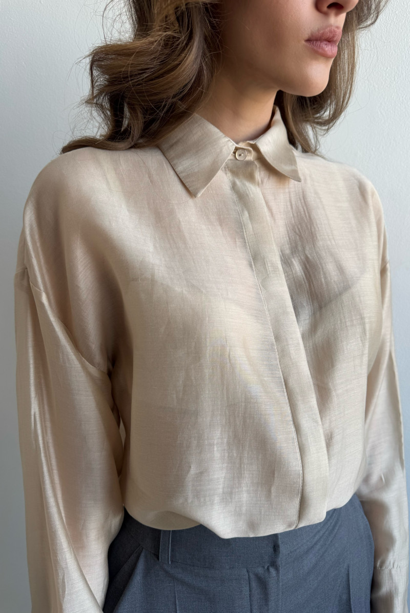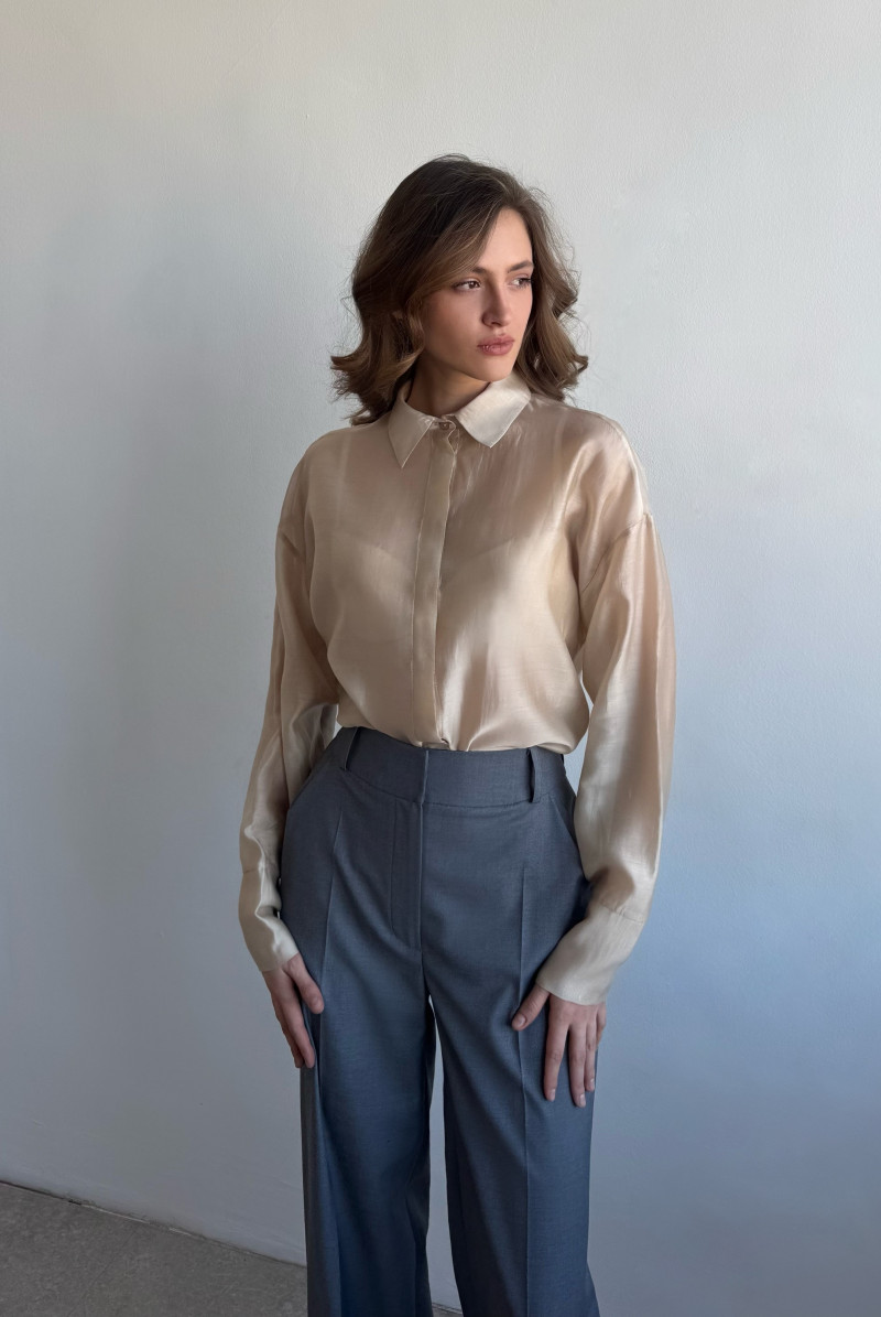 Блуза "оверсайз". Линия плеча спущена, рукав длинный с манжетом. Линия низа фигурная, воротник рубашечный на стойке. Застёжка "потайная", на пуговицы спереди.