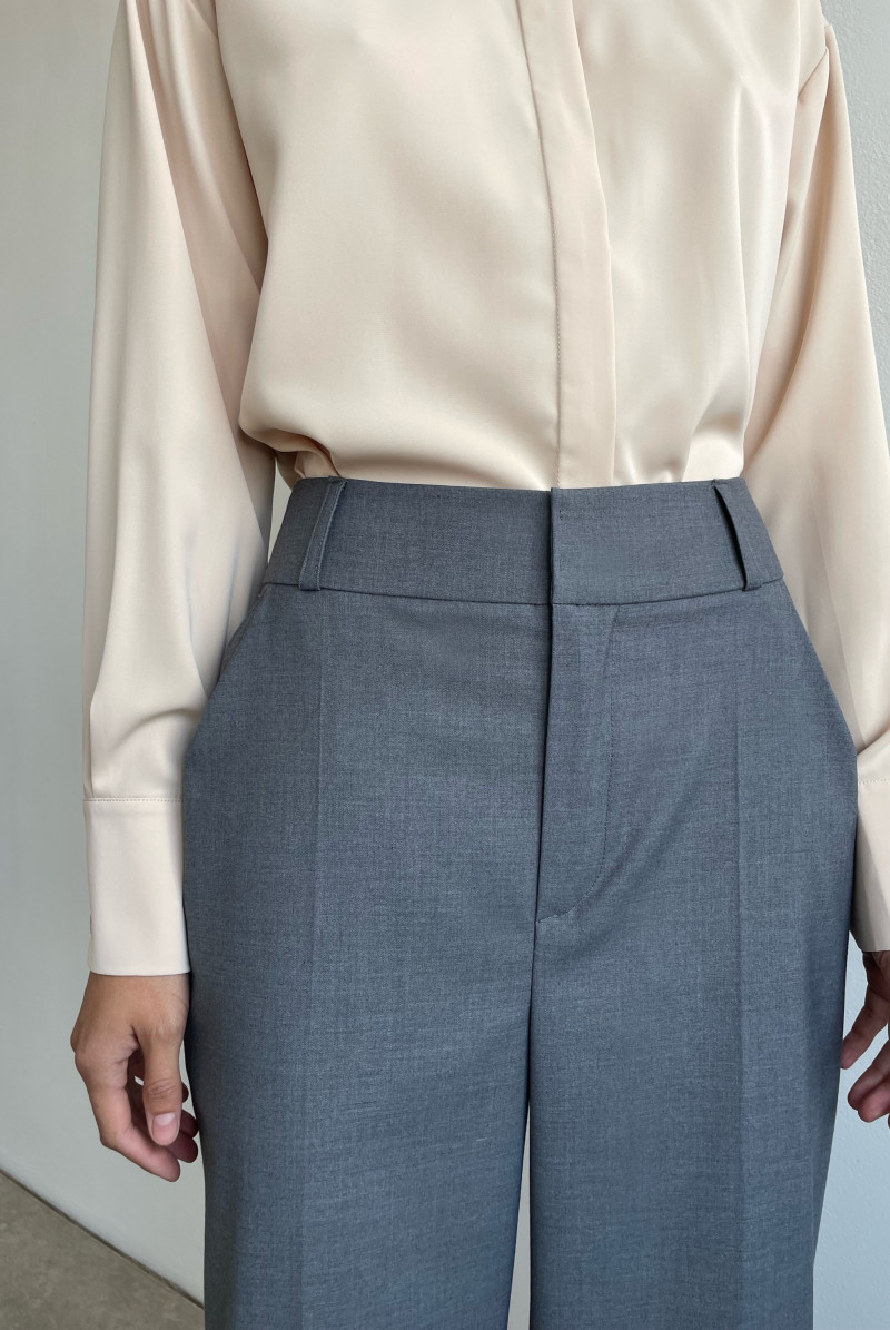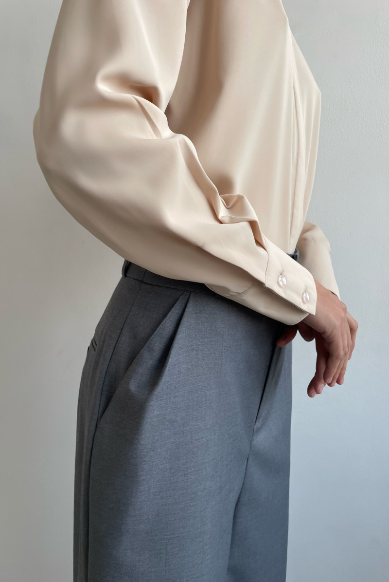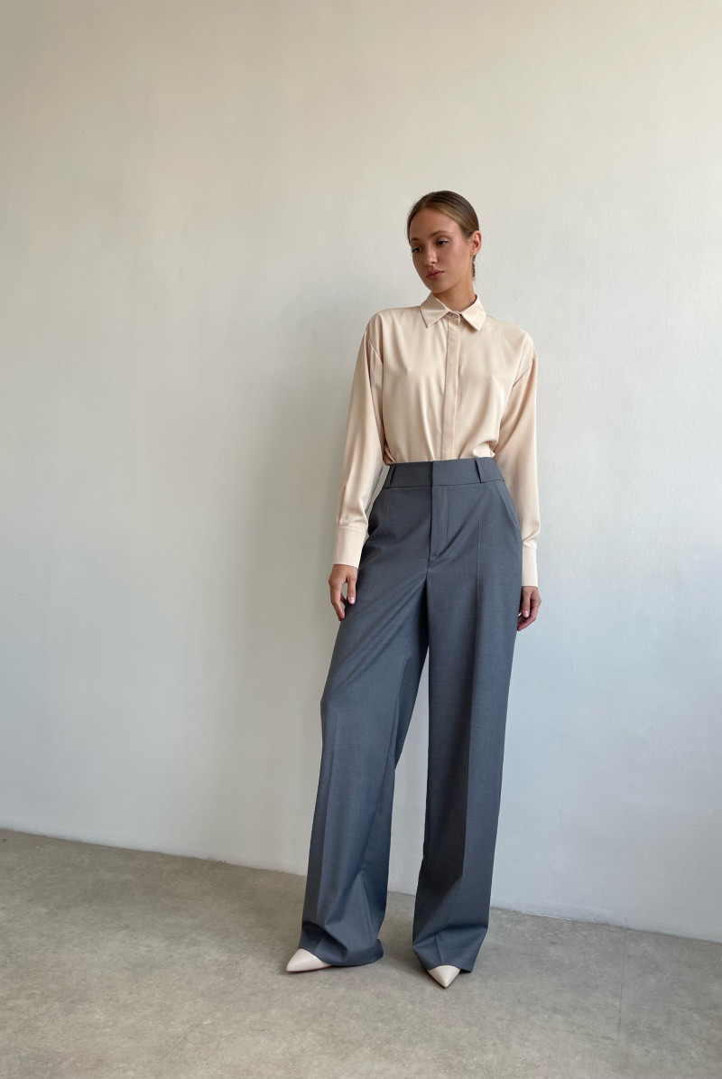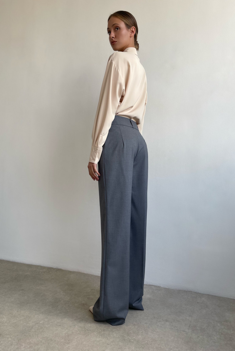 Прямые брюки на подкройном (стачном) поясе со стрелками. Карманы с отрезным бочком, спереди к которым направлена складка. Застежка спереди "гульфик" с молнией. На поясе 2 крючка, на правой задней половинке брюк карман в рамку с застежкой на пуговицу.