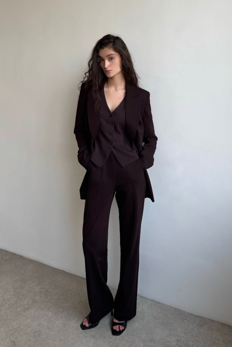 Прямые брюки с посадкой "на талии" со стрелками. Карманы спереди (с отрезным бочком). На поясе шлёвки. Застежка гульфик с молнией.