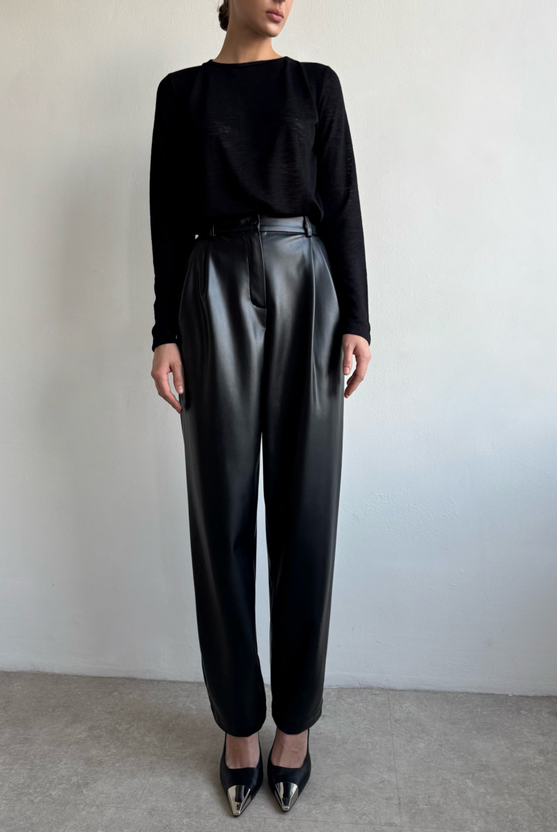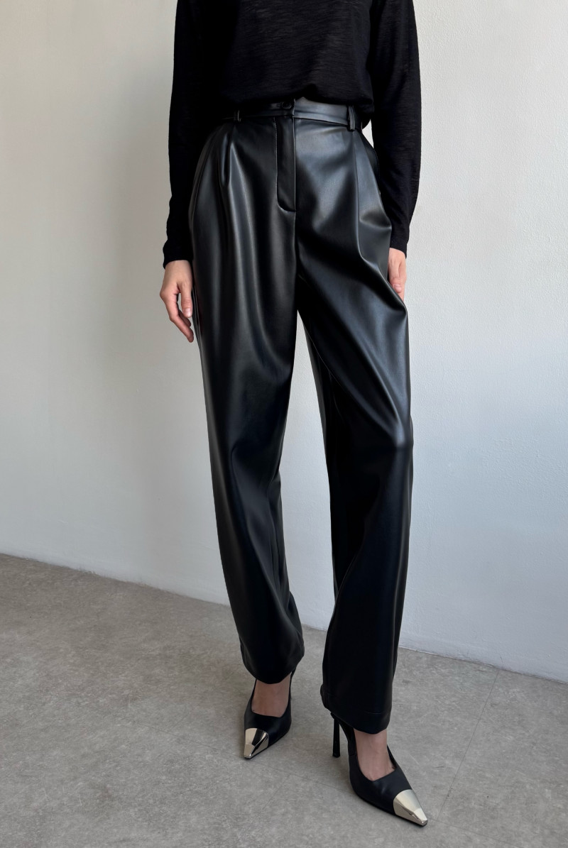 Брюки "бананы" со складками, посадкой на талии. Застёжка на молнию и потайной крючок спереди. Карманы спереди.