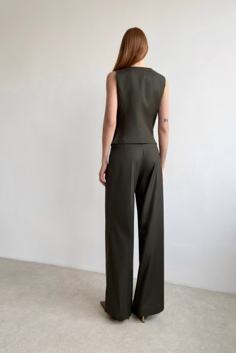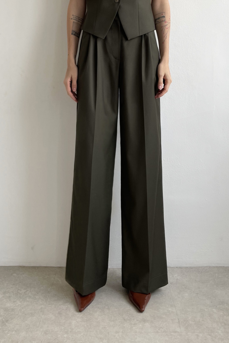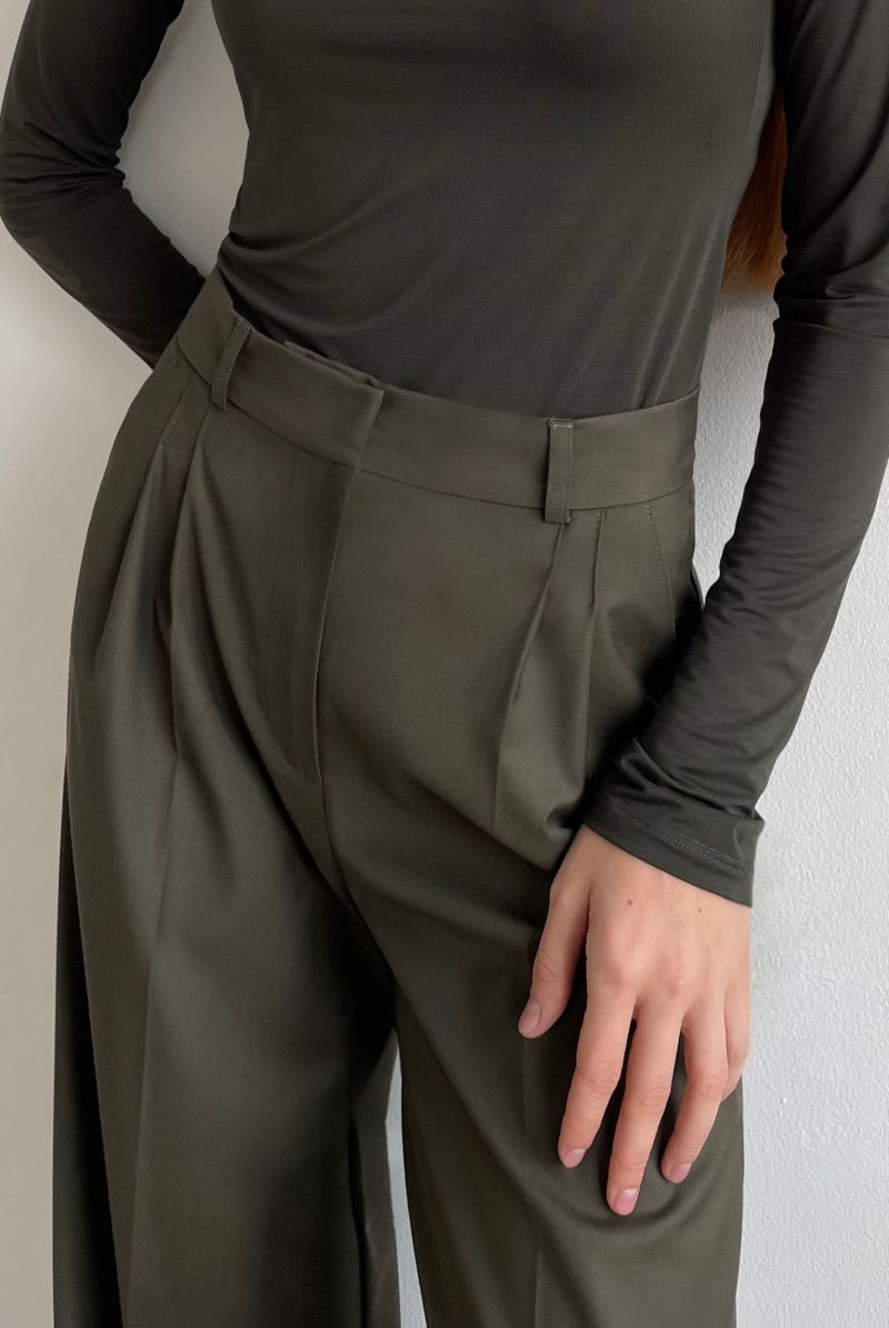 Брюки свободного кроя на поясе со шлевками, по переду складки, карманы в боковых швах. Длина изделия по боковому шву 110 см