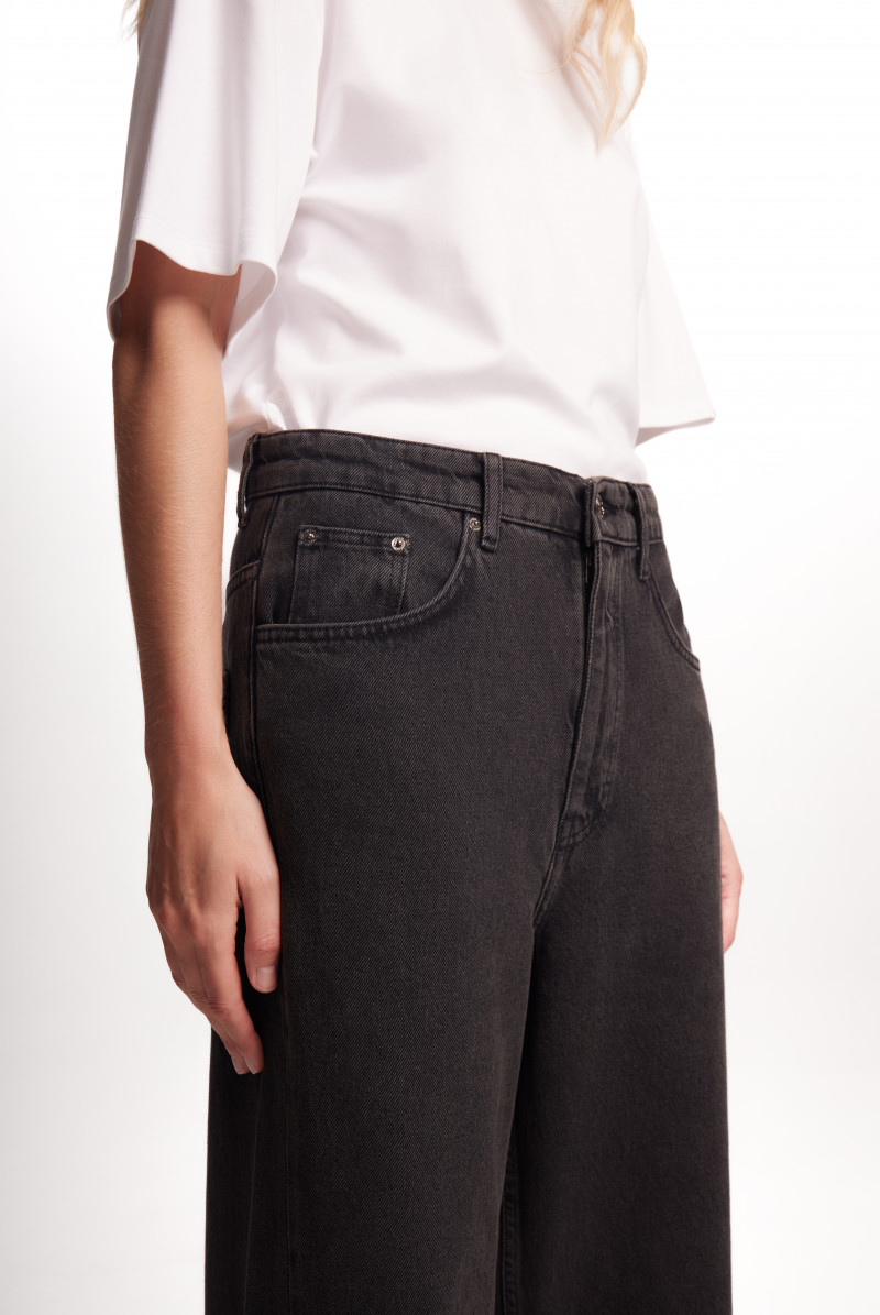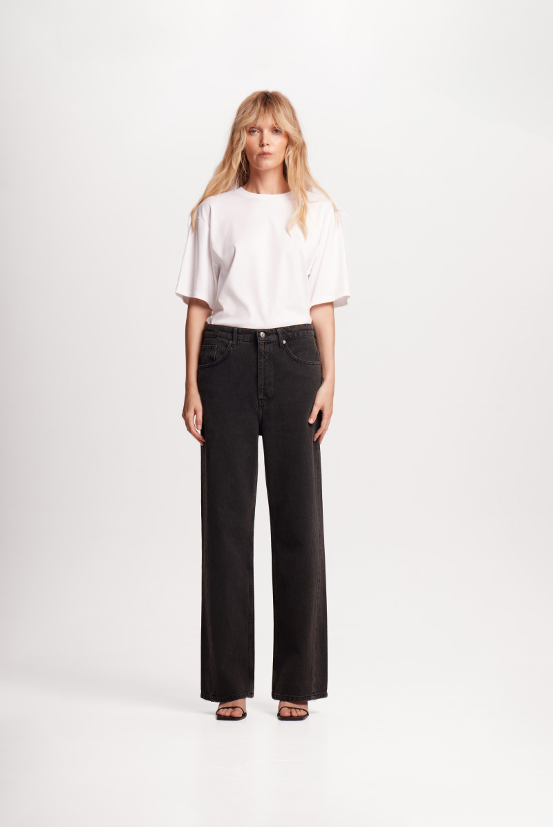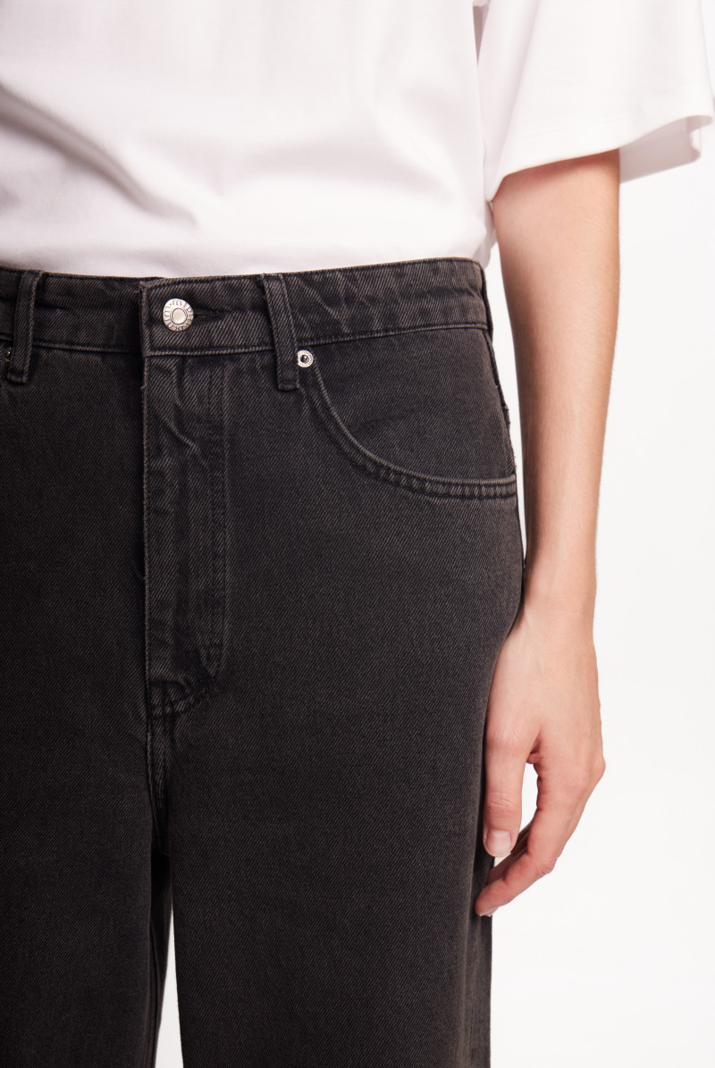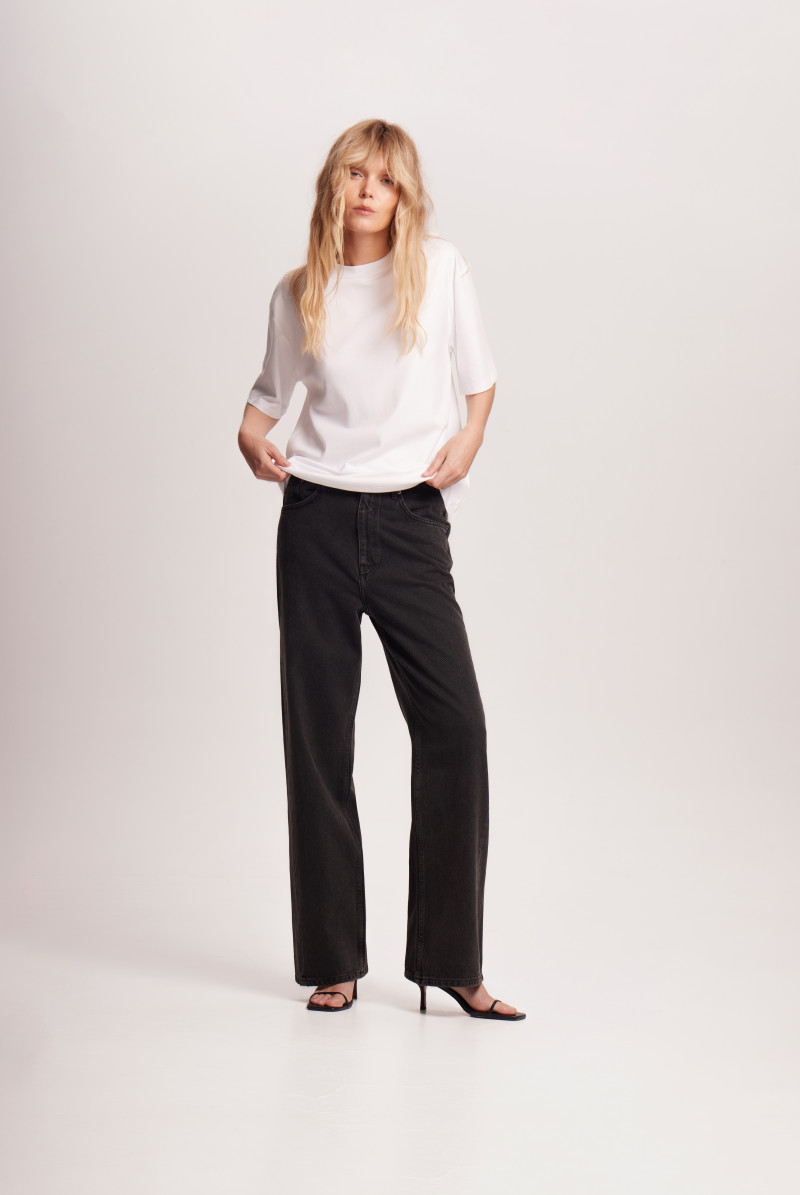 Джинсы с высокой посадкой "на талии". Брючины прямые, широкие от бедра к низу.