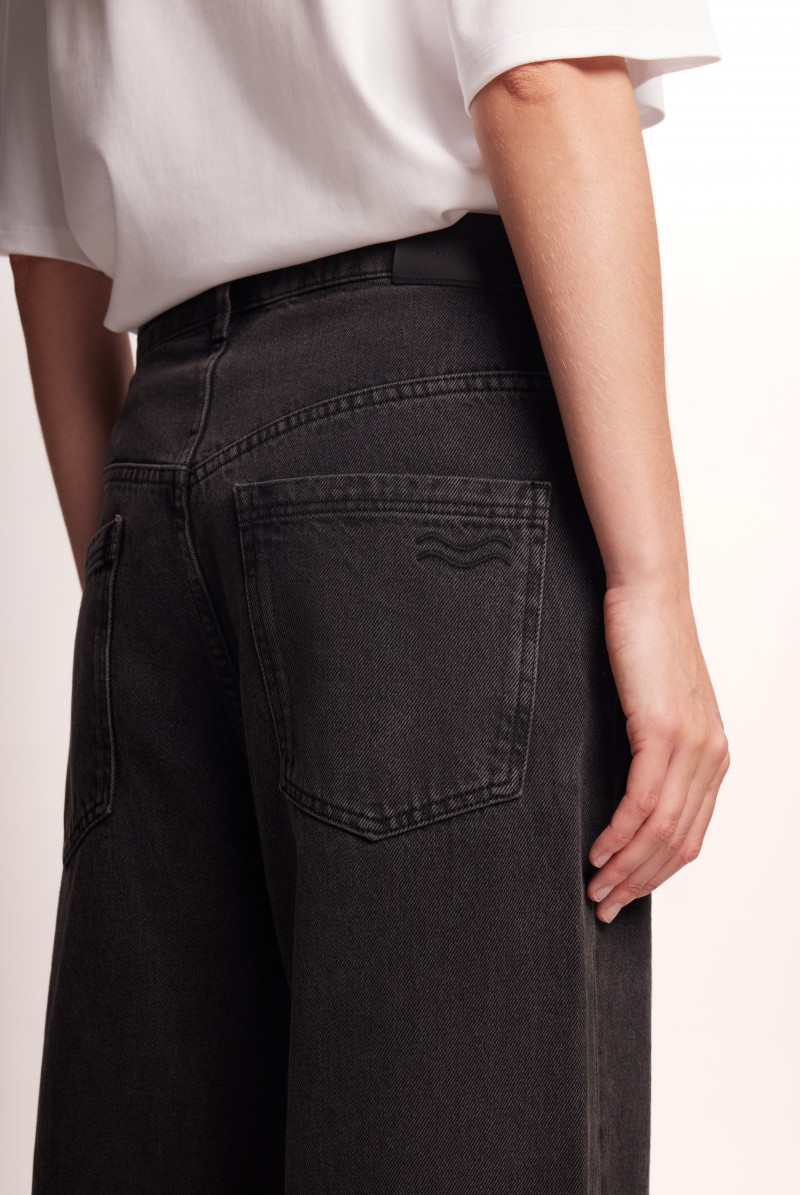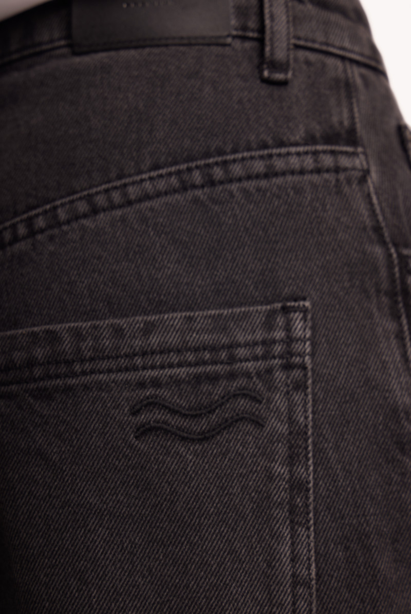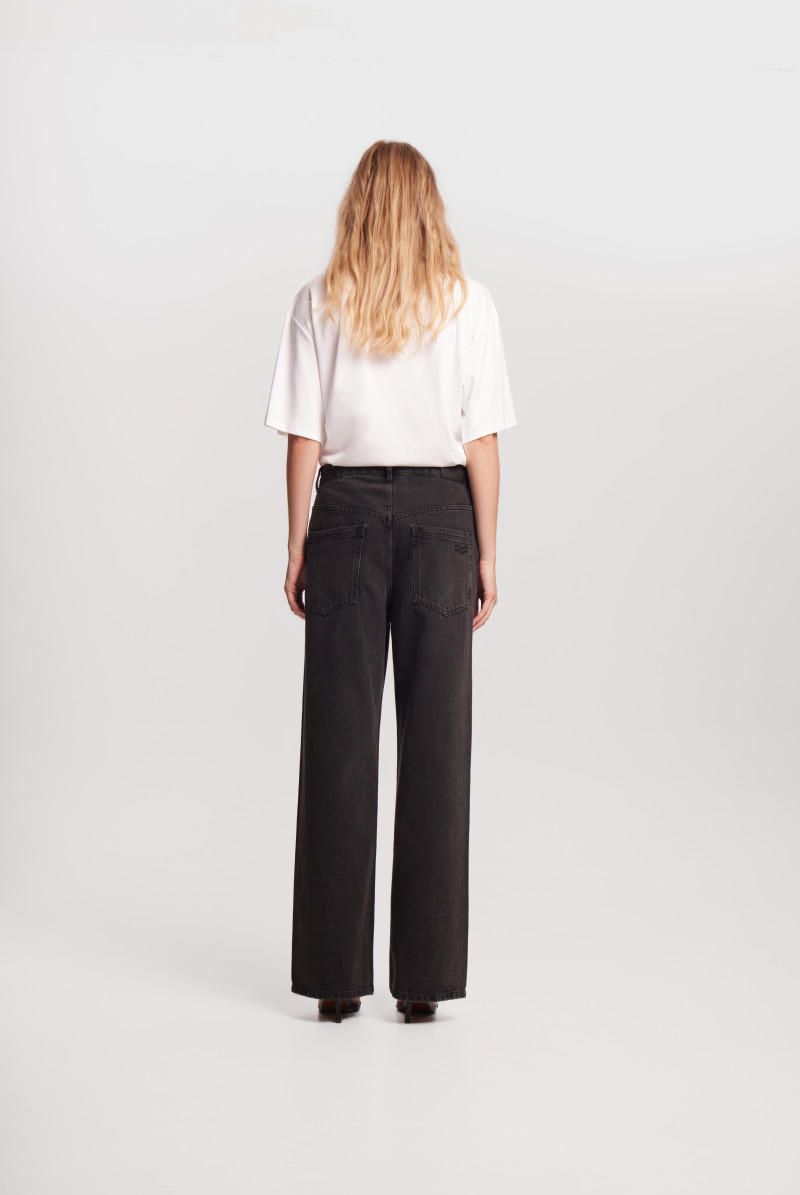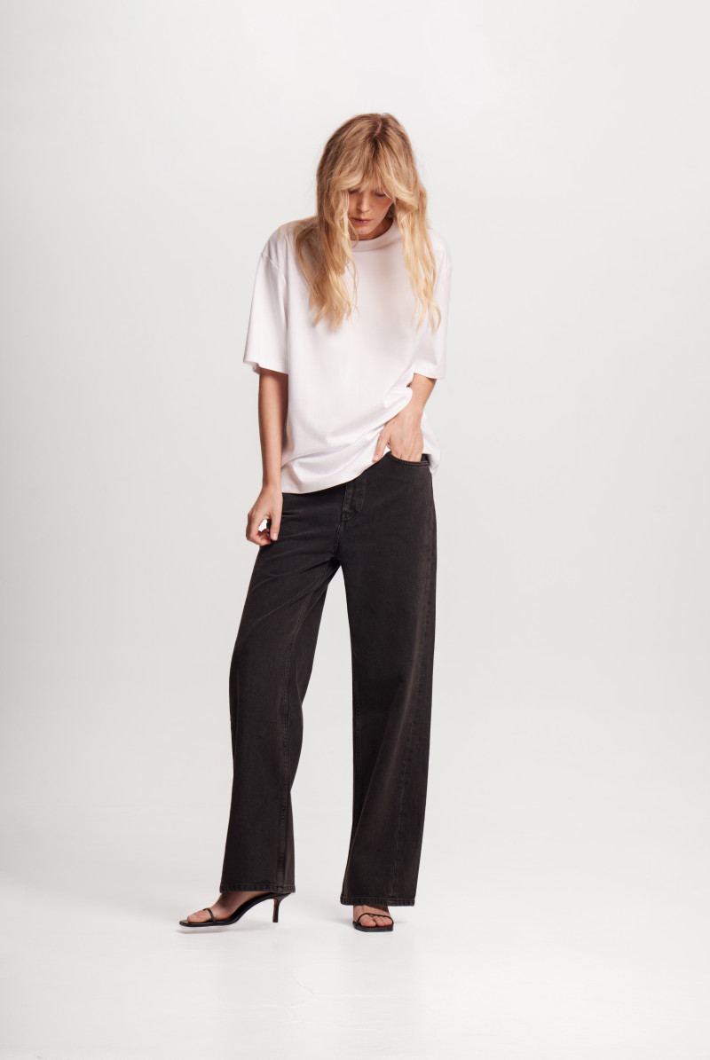 Джинсы с высокой посадкой "на талии". Брючины прямые, широкие от бедра к низу.