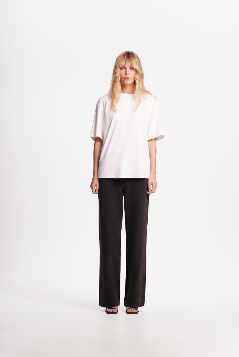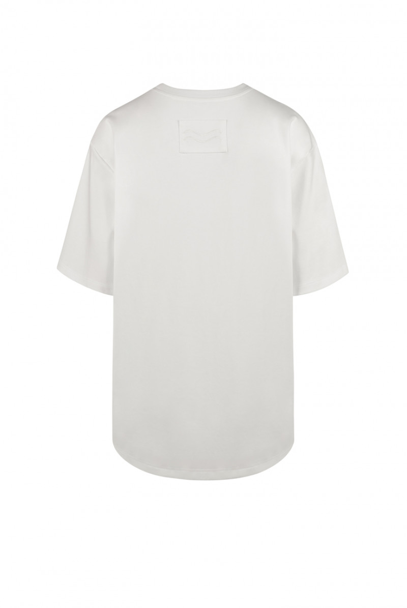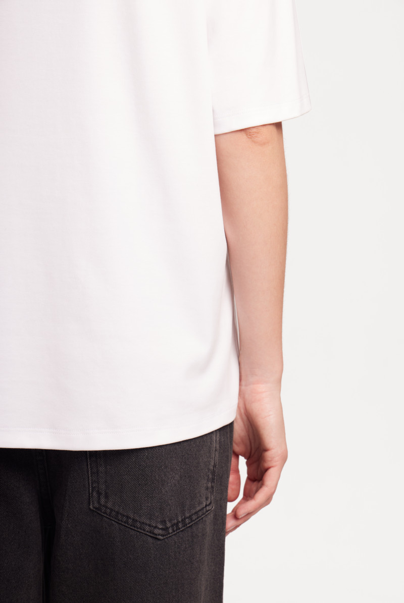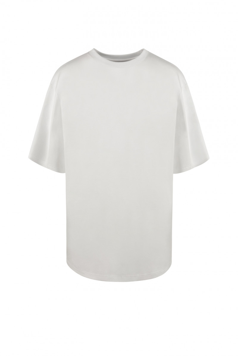Футболка прямого кроя (с небольшим овесайз объемом). Линия плеча спущена, рукав короткий, вырез горловины круглый.