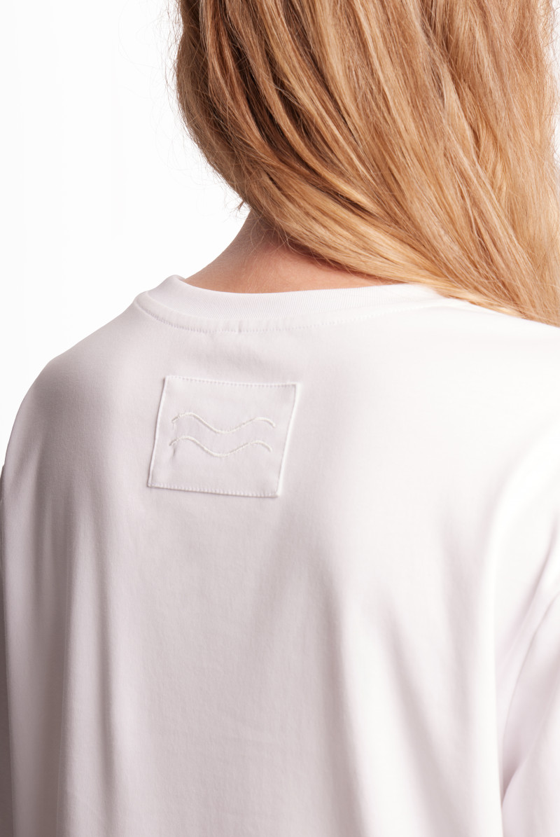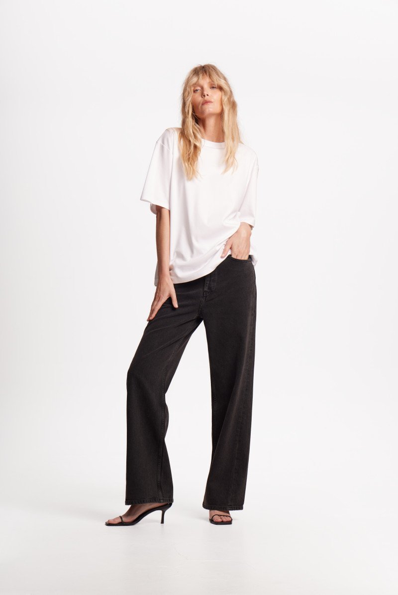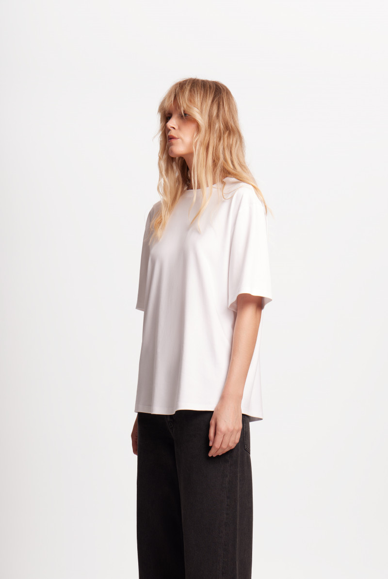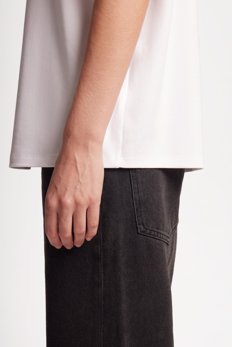 Футболка прямого кроя (с небольшим овесайз объемом). Линия плеча спущена, рукав короткий, вырез горловины круглый.