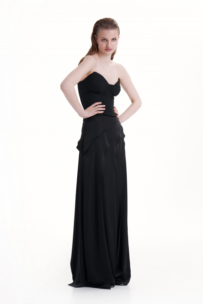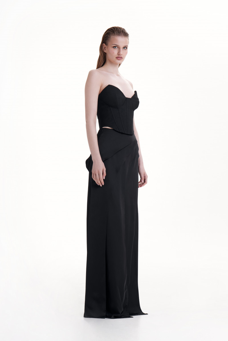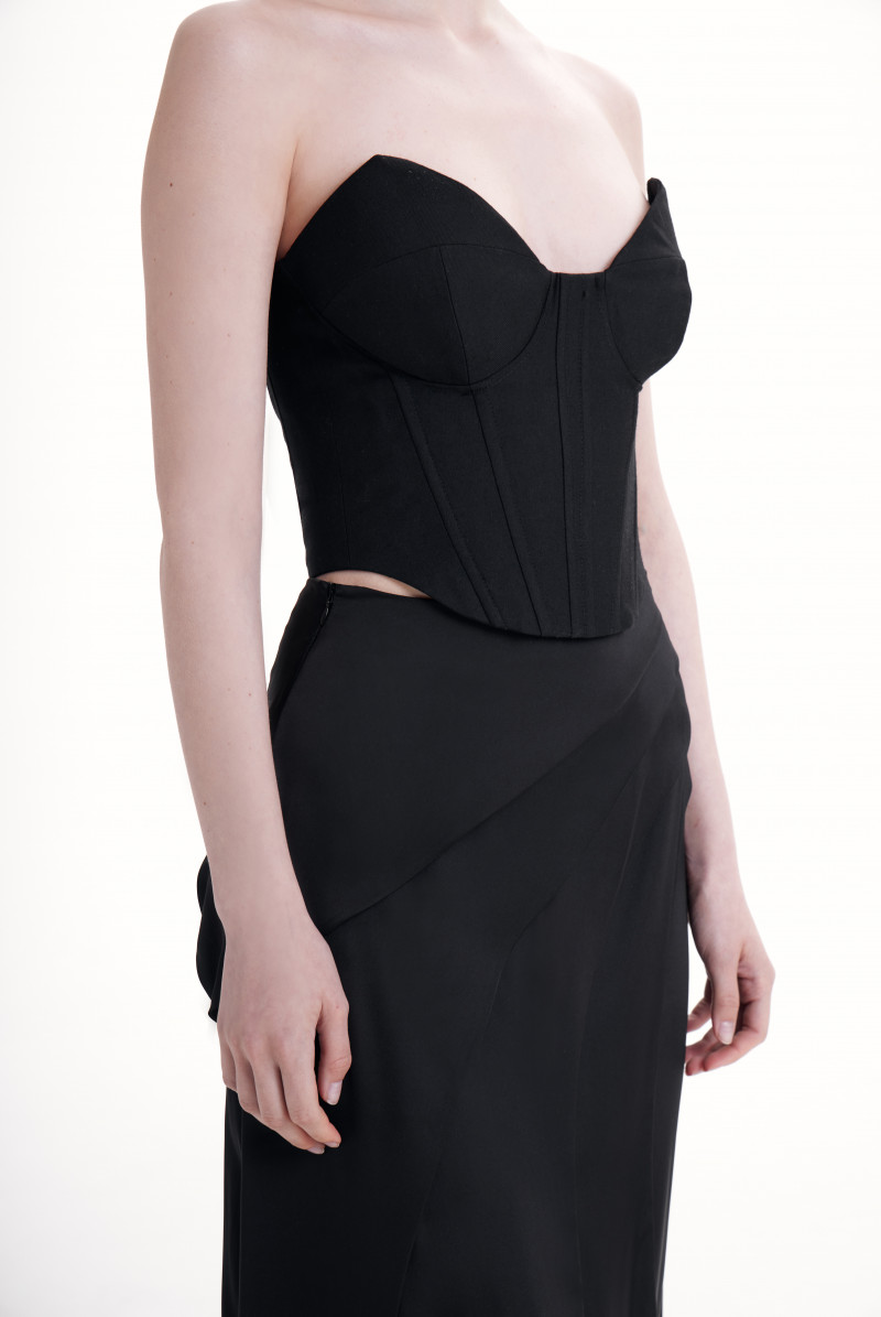 Корсет с чашками. Линия низа фигурная, удлиненная спереди. По рельефным швам отстрочка и регилин. Застёжка на молнию по центру спинки.