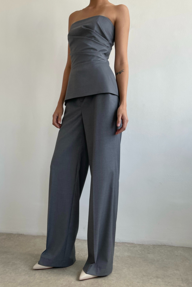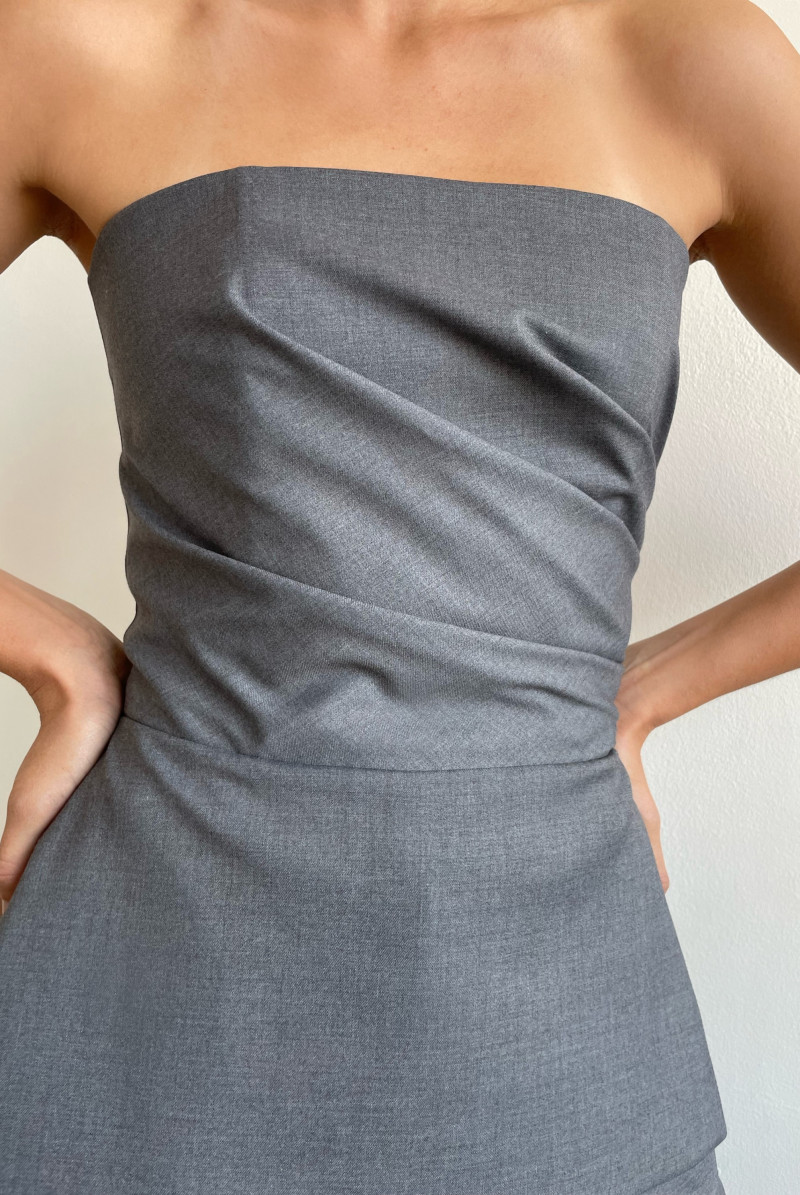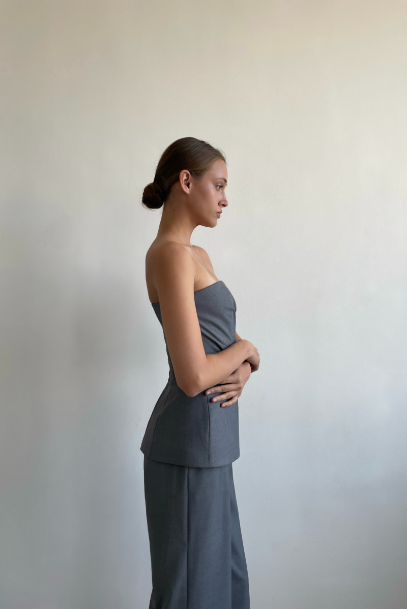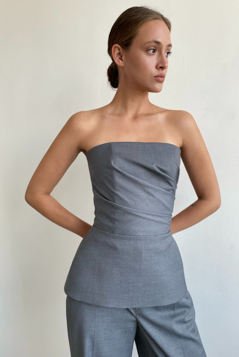 Корсет с баской выполнен из костюмной ткани. По переду лифа заложены ассиметричные складки. Разъемная застежка-молния в среднем шве спинки.