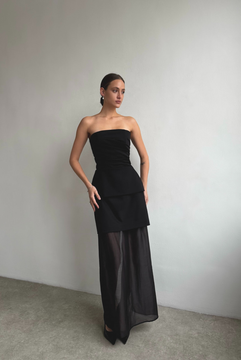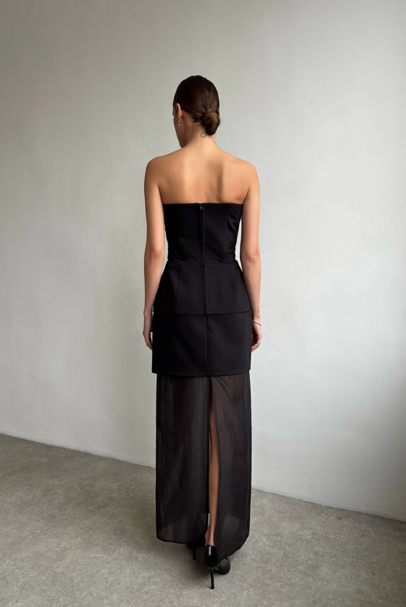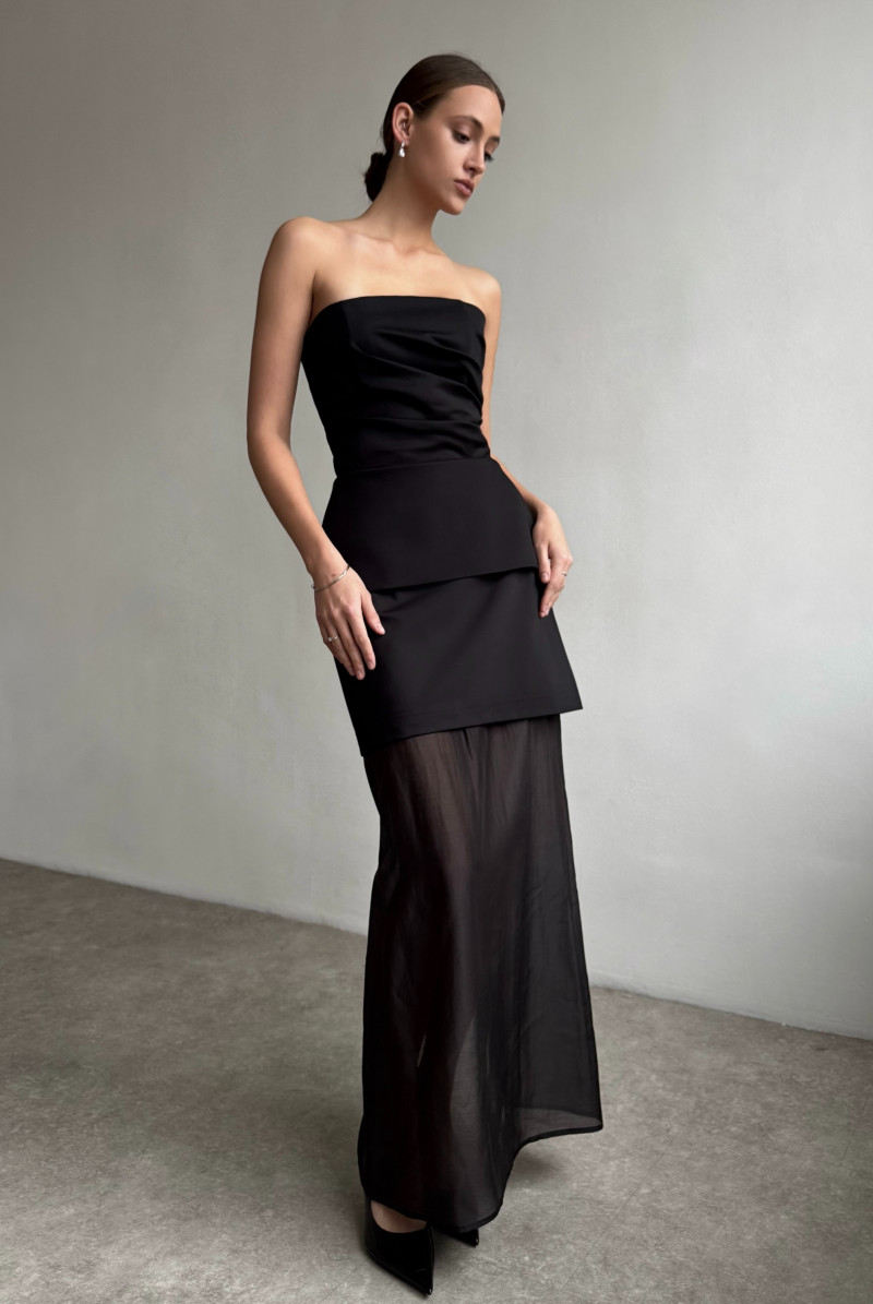 Корсет с баской выполнен из костюмной ткани. По переду лифа заложены ассиметричные складки. Разъемная застежка-молния в среднем шве спинки.
