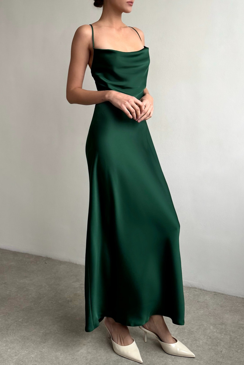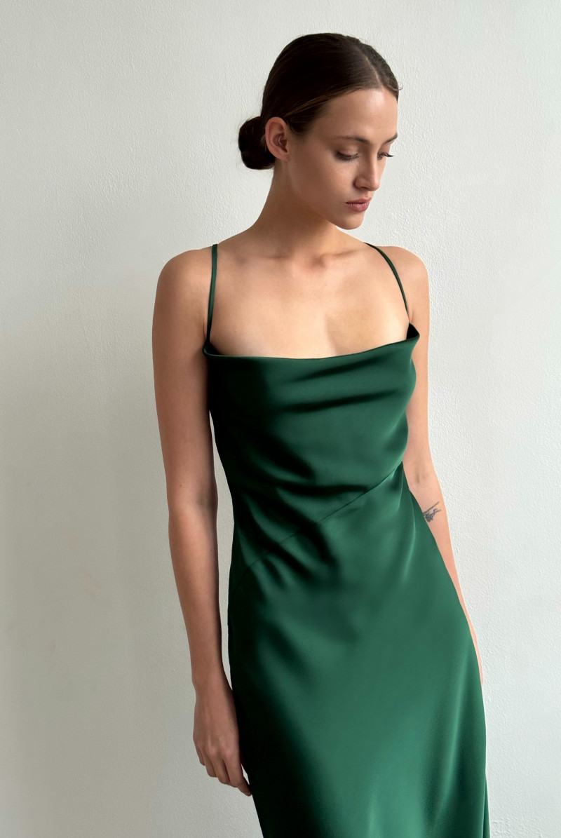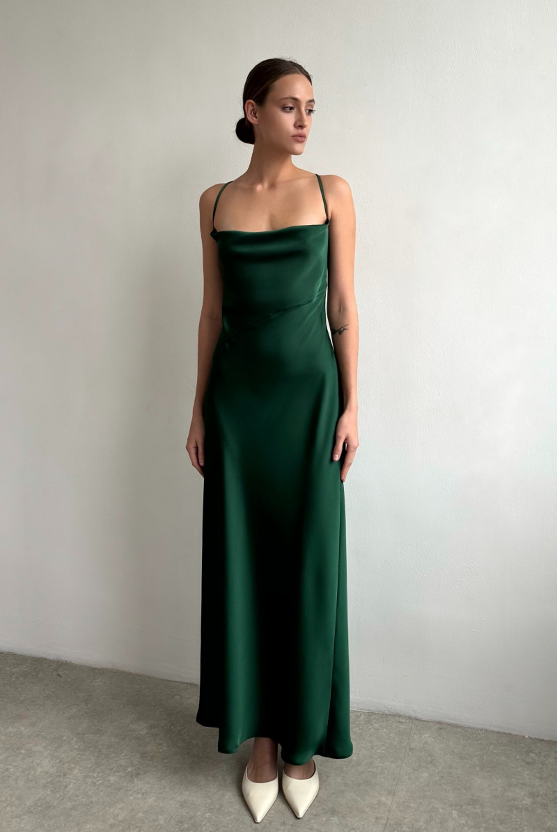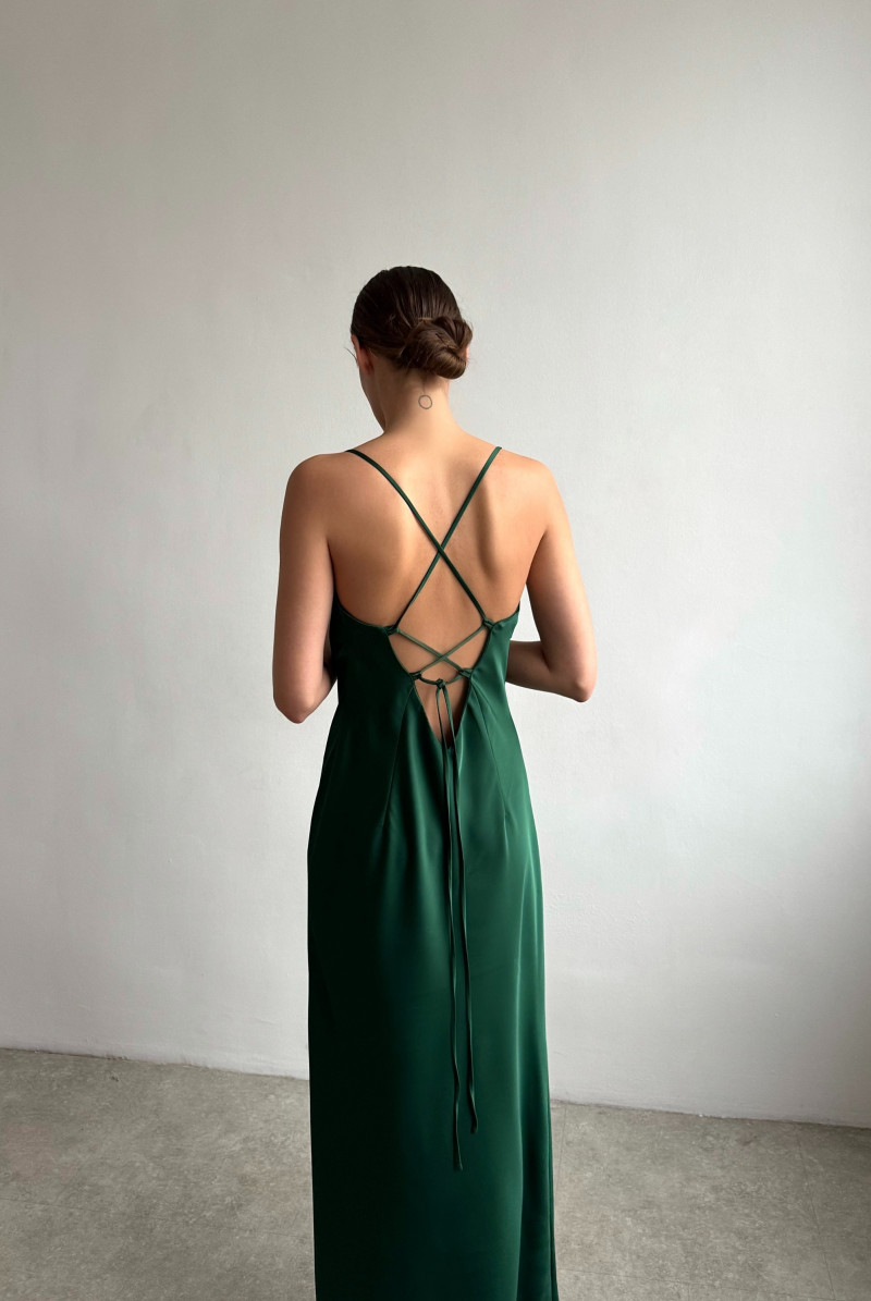 Платье прилегающего силуэта, кроя "по косой". На детали переда расположен наклонный подрез чуть ниже левой груди к правому боковому шву. Декольте в форме "качели". На спинке глубокое V-образное декольте. Платье держится на тонких бретелях-завязках, которые продеваются в петли выреза спинки и завязываются на бант. Платье длиной миди.