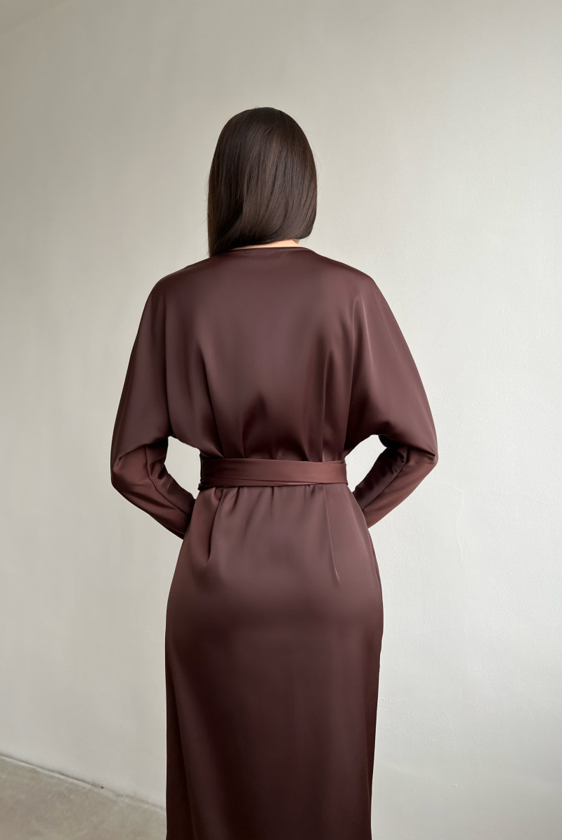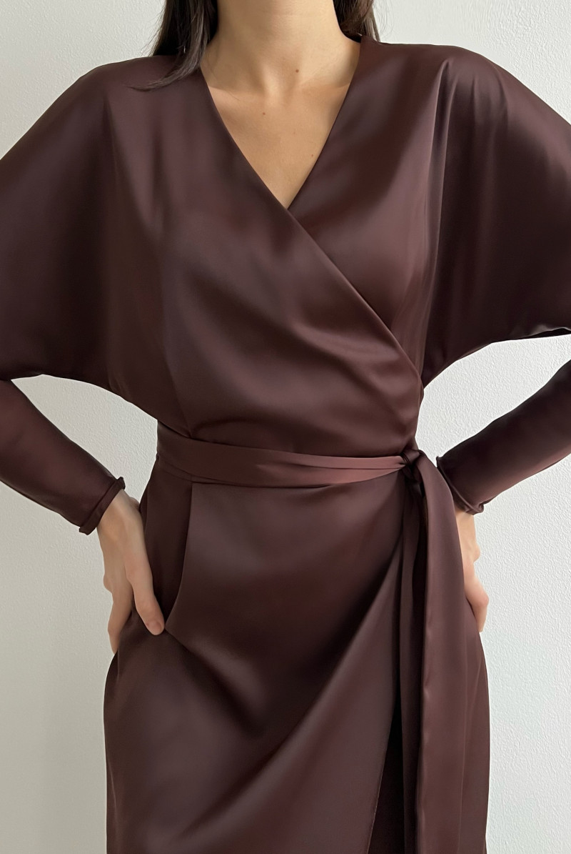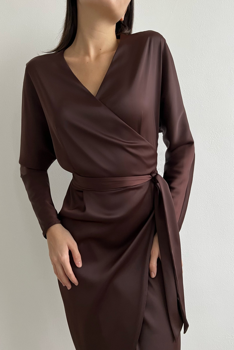 Платье длины миди "на запах" с притачным поясом по талии. Рукав "летучая мышь", зауженный к низу.