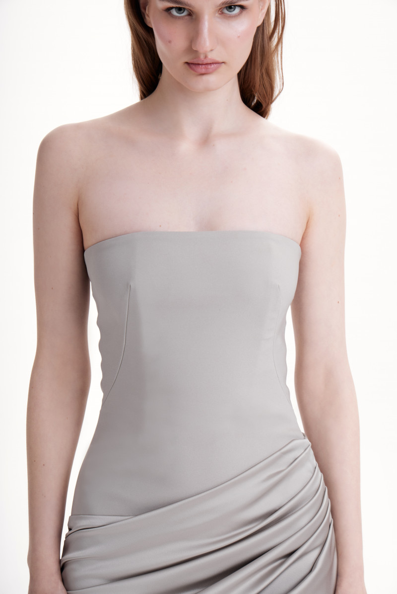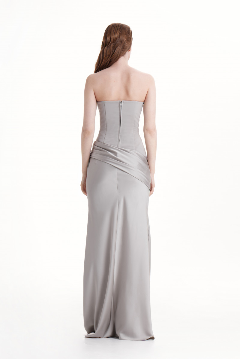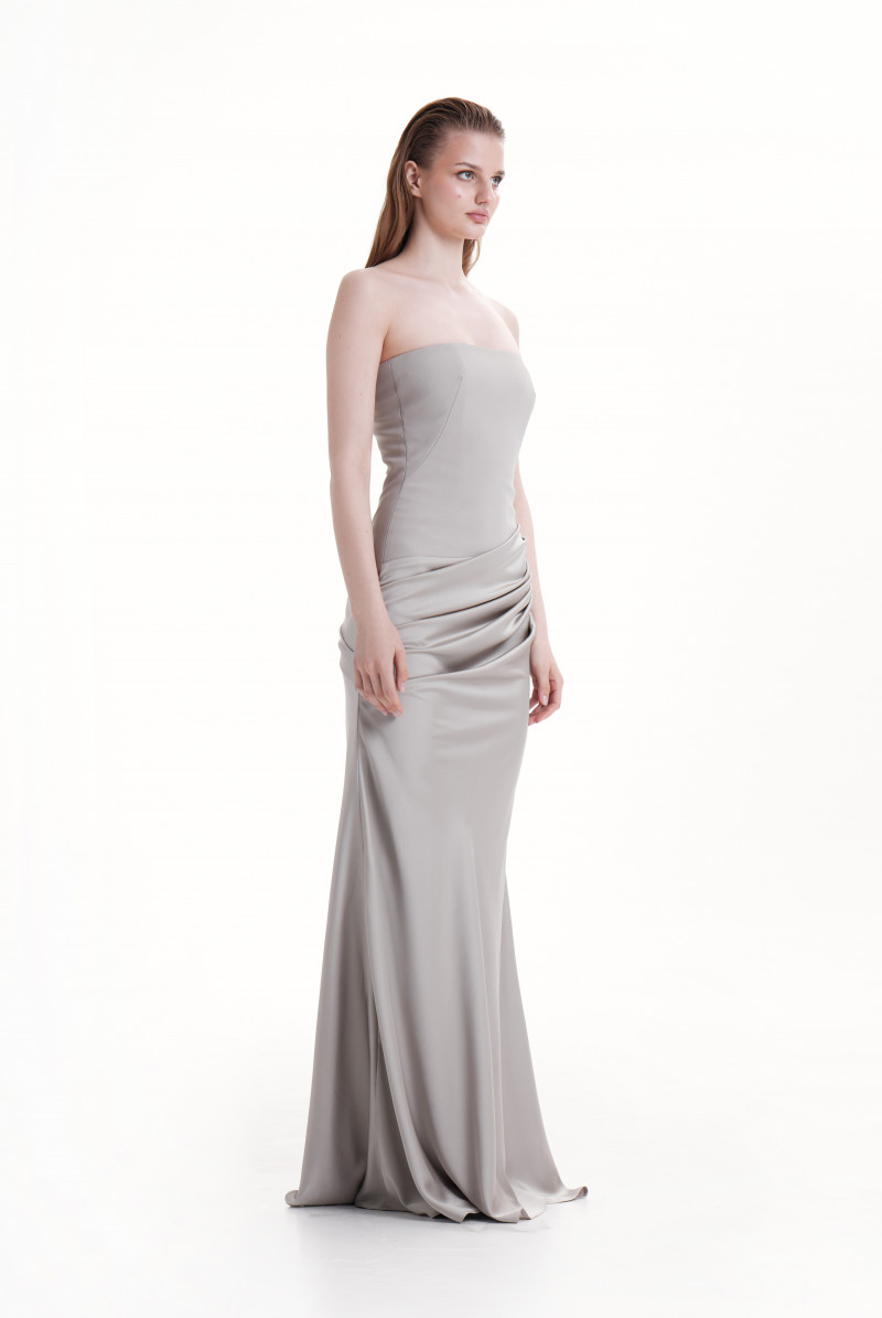 Корсетное платье в пол приталенное, линия корсета ассиметрична. Юбка косого проявления, силуэт "рыбка" с расклешением от линнии колена. По переду и спинке драпировки, застёжка на молнию по середине спинки.
