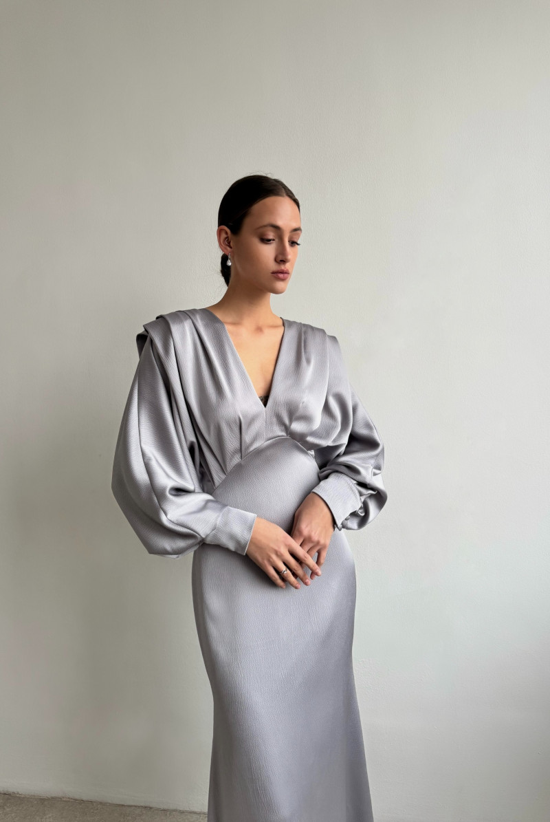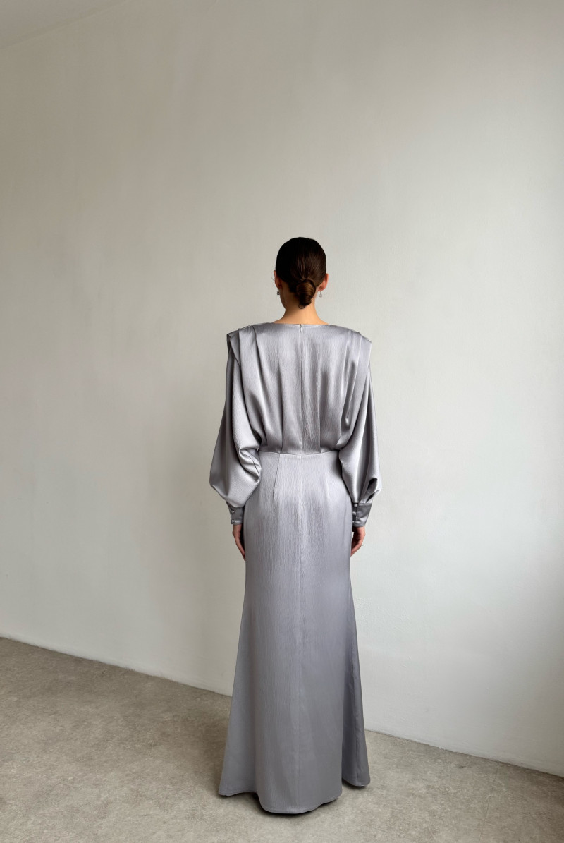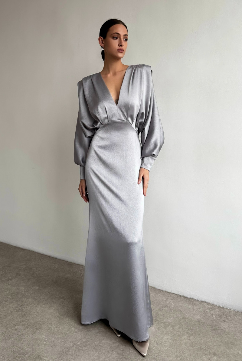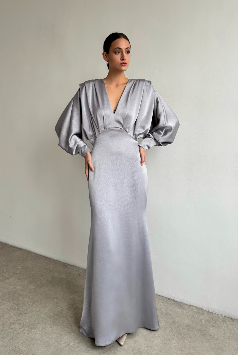 Платье приталенное, длина макси. Юбка отрезная, слегка расширенна книзу. На деталях переда и спинки заложены мягкие защипы по плечам и талии. Вырез горловины глубокий V-образный. Рукав длинный, объемный и цельнокроенный. По низу рукава манжет с петлями и пуговицами. В среднем шве спинки потайная застежка-молния.