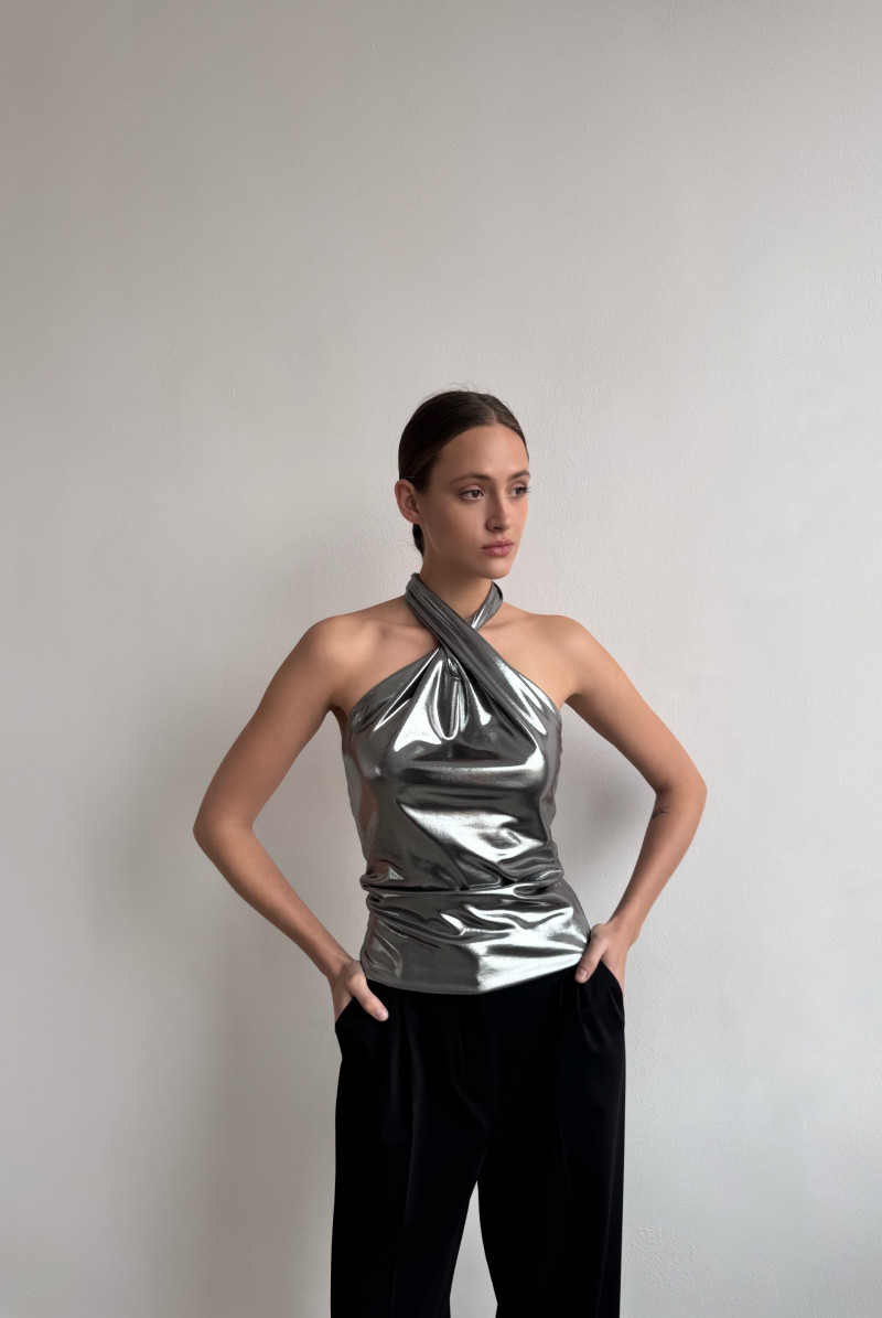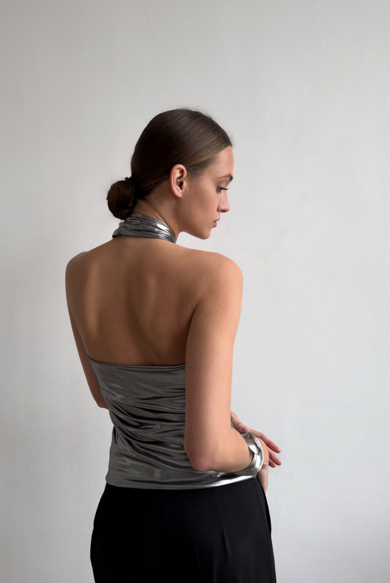 Топ-халтер приталенный длиной выше бедер. Спереди лямка наперекрест и драпировка.
