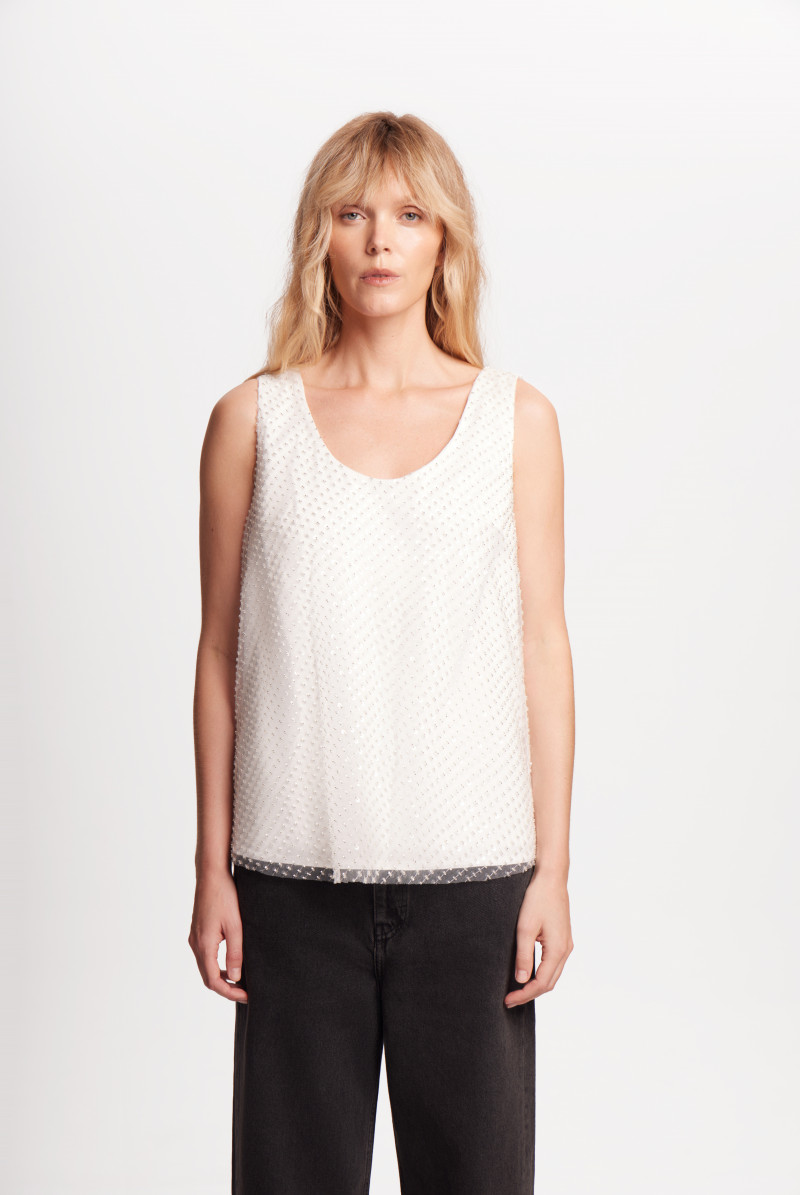 Топ прямого силуэта, длиной выше линии бедер. Сверху основной материал дублируется сеткой с бисером, выкроенной "по косой".