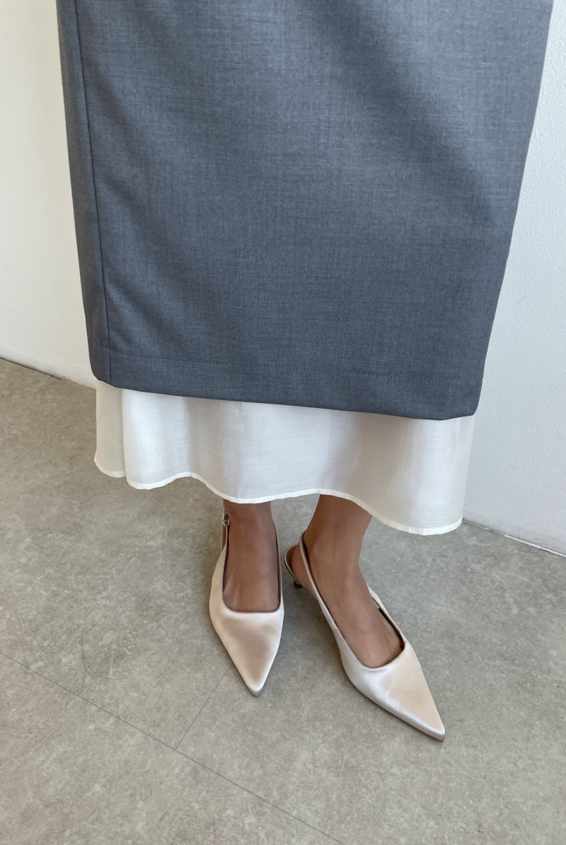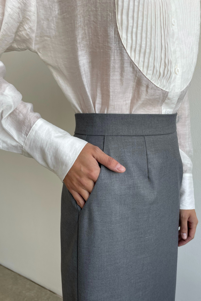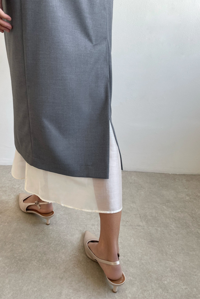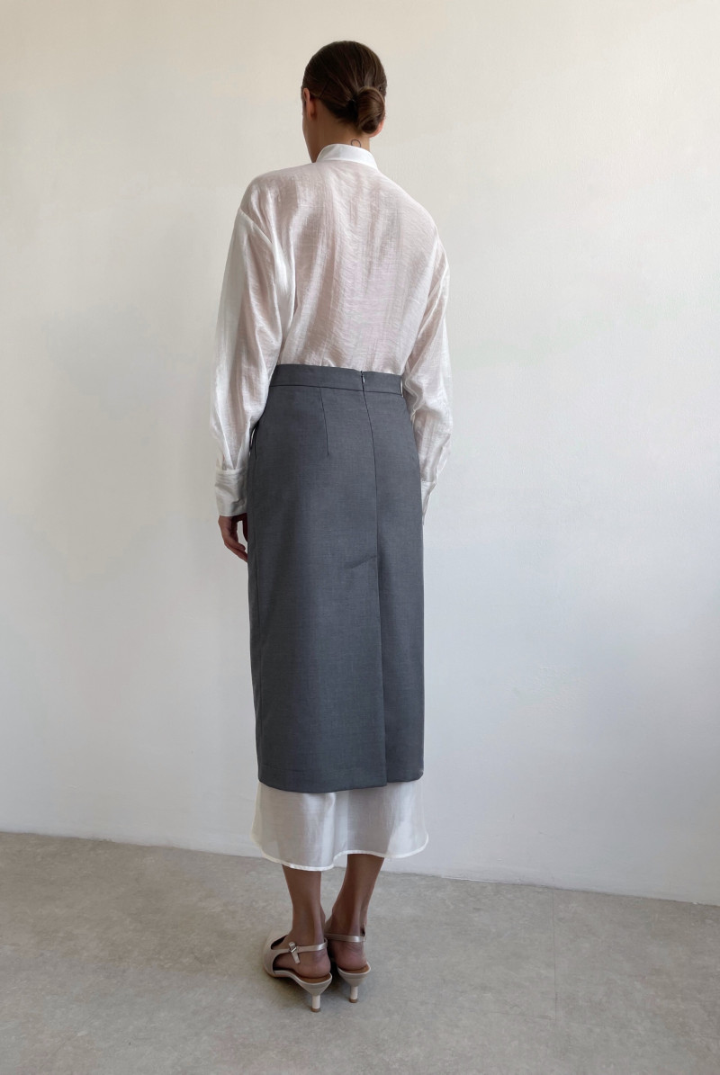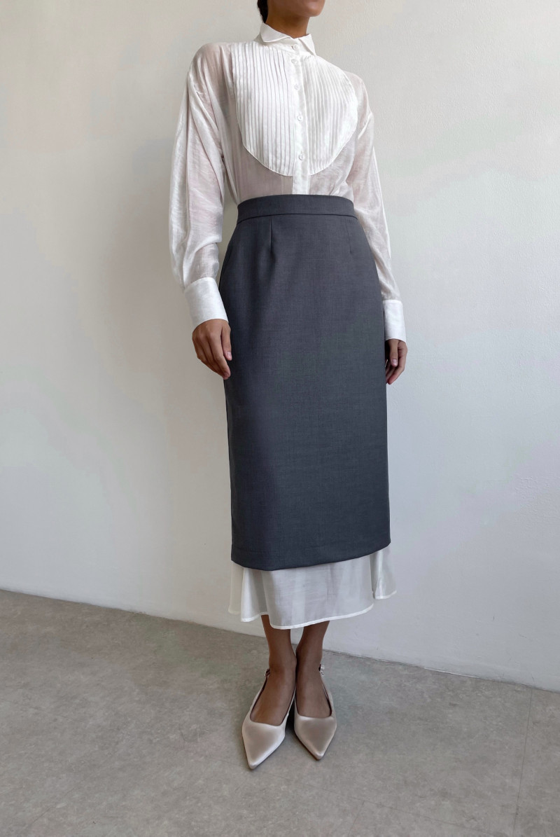 Юбка до середины бедра прямого силуэта. Спереди - карманы. Нижний слой оформлен воланом из органзы. Юбка на подкладе с молнией и шлицей сзади.