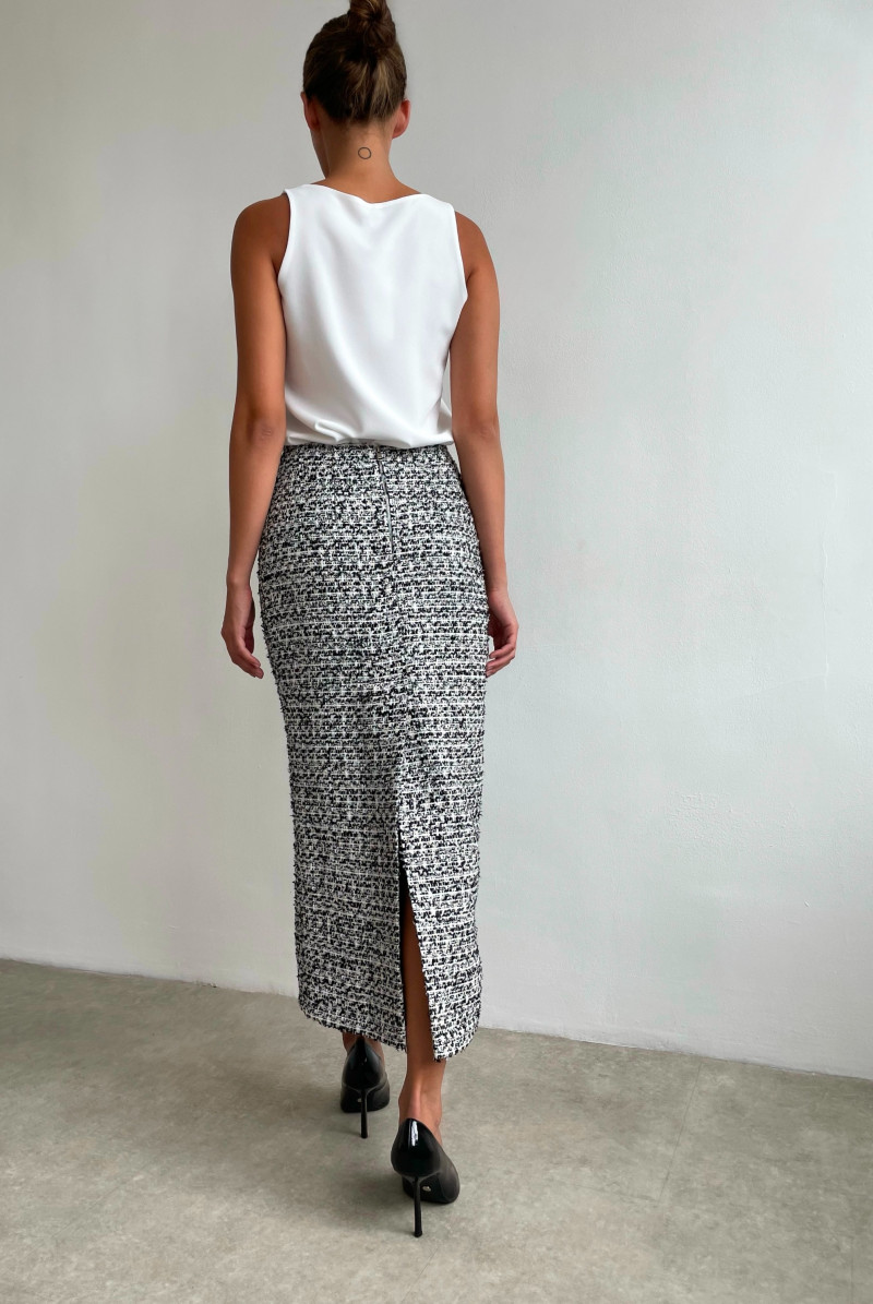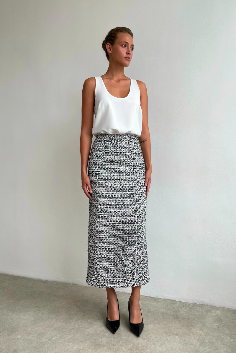 Юбка длиной миди прямого силуэта. Юбка на притачной подкладке. Сзади молния и шлица.