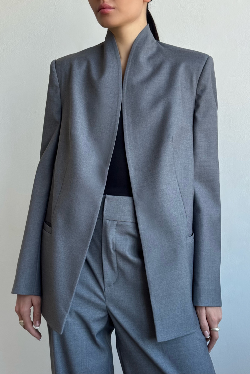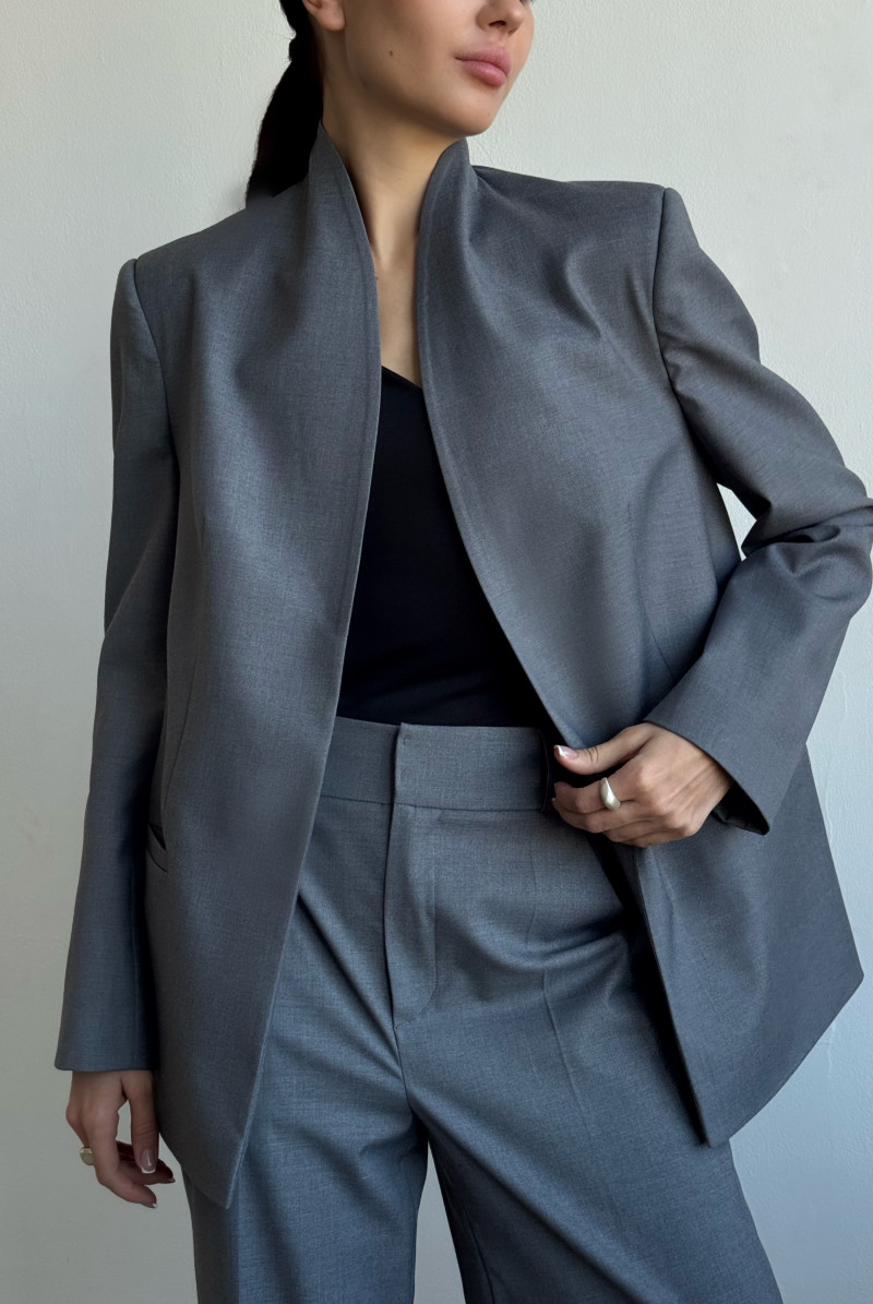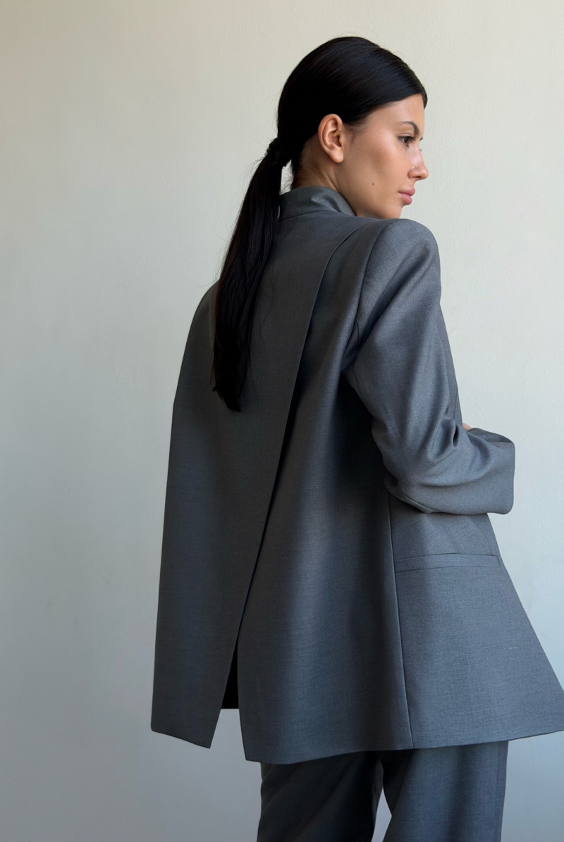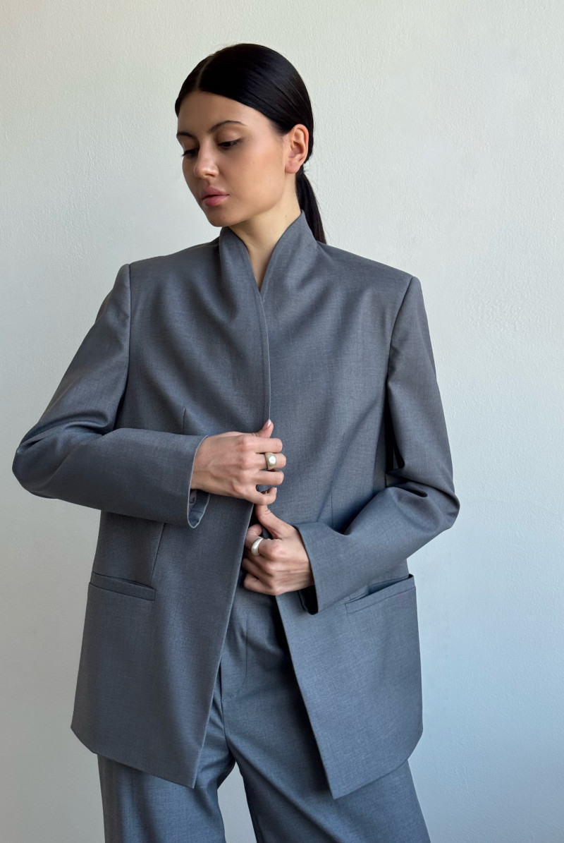 Жакет прямого силуэта, увеличенного объема с воротником цельнокроенная стойка. Рукава двушовные, втачные, длинные,прорезной карман с листочкой. Спинка двойная с запахом. Жакет на притачной подкладке.