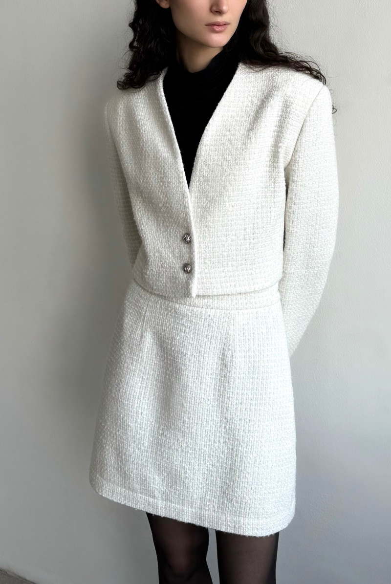 Укороченный жакет до линии талии из твида на пуговицах с расширенной линией плеча. Рукав длинный двушовный